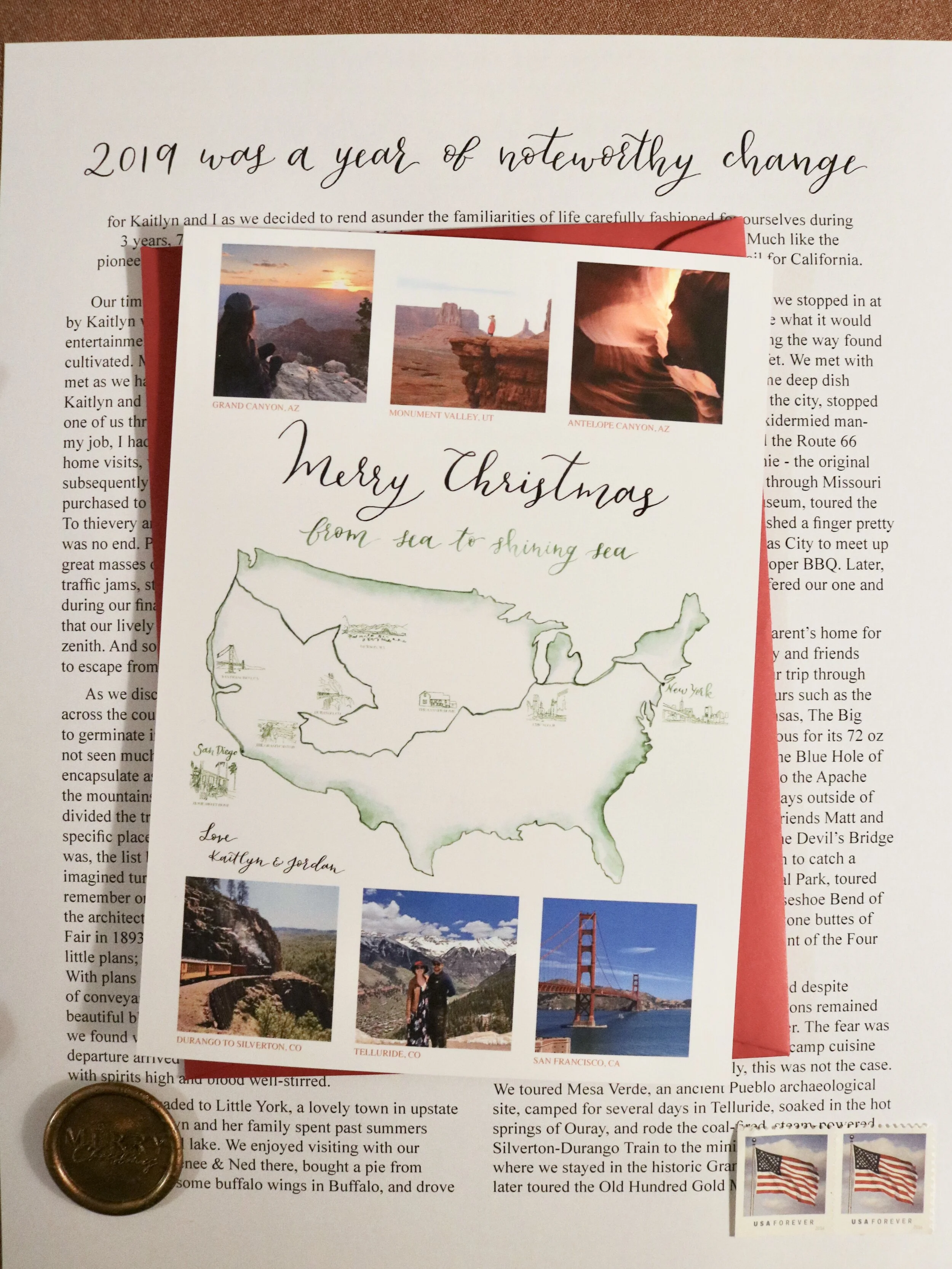 Here is the letter that Jordan wrote to send out with our Christmas cards this year. I loved reading it myself so I thought I’d share with everyone! It is a summary of our cross-country trip from New York to California this past summer. Enjoy!